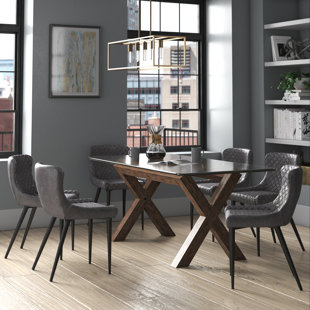 Gather with friends and family in style using this dining set, which is brimming with industrial flair. The set includes a dining table with a sleek silhouette and cross-leg frame, paired with six chairs featuring tapered legs, diamond stitching and a dark grey upholstery for added urban appeal. Assembly is required.