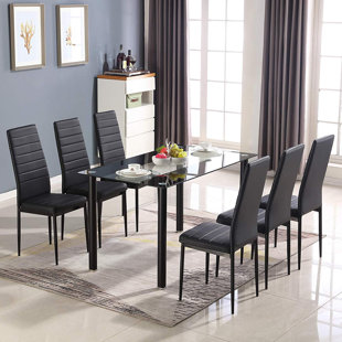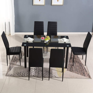 This glass tabletop has clear tempered glass with a gorgeous black doubled striped design. It is a stunning design combining both the style of clear and black tempered glass into one dining table. It comes with 6 black chairs that are padded for comfort and are a stylish and classic design. These chairs were also made to fire resistance standards required by the UK, including the cigarette and match ignition test of the 1988 safety regulations. Easy to assemble and instructions are included.