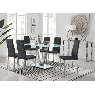 This dining set combines a modern chrome look with clear glass. Acting not only as sturdy support the chrome finished metal V legs also add an elegant and unique touch. Boasting a large 140cm x 80cm table top made from strong tempered glass, the table offers plenty of room for dining with guests. The table also has easy-clean and wipe surfaces allowing it to look brand new for years to come! Featuring on-trend chrome ed legs and supportive seat pads, these are eye-catching chairs don't compromise on comfort.