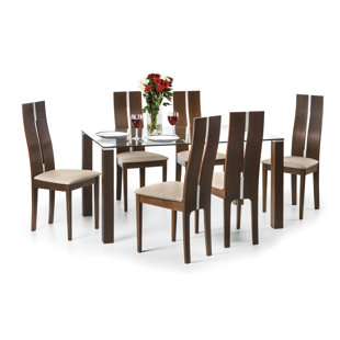 This dining set includes a contemporary dining table made from solid beech stained to a walnut colour and 6 chairs with a sculpted high back. Made from solid beech with a walnut finish and brushed metal effect insert.